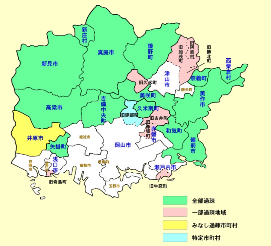 地方都市では高齢化や人口流出が進み、親の家を引き継いでも使い道がないケースが増えています。岡山市や倉敷市でも、中心部や観光地から少し離れた住宅地で放置住宅が増加中です。岡山県下で見ると、県央や県北部はほぼ全域で過疎指定されており、空き家の増加は今後避けられないと思われます。