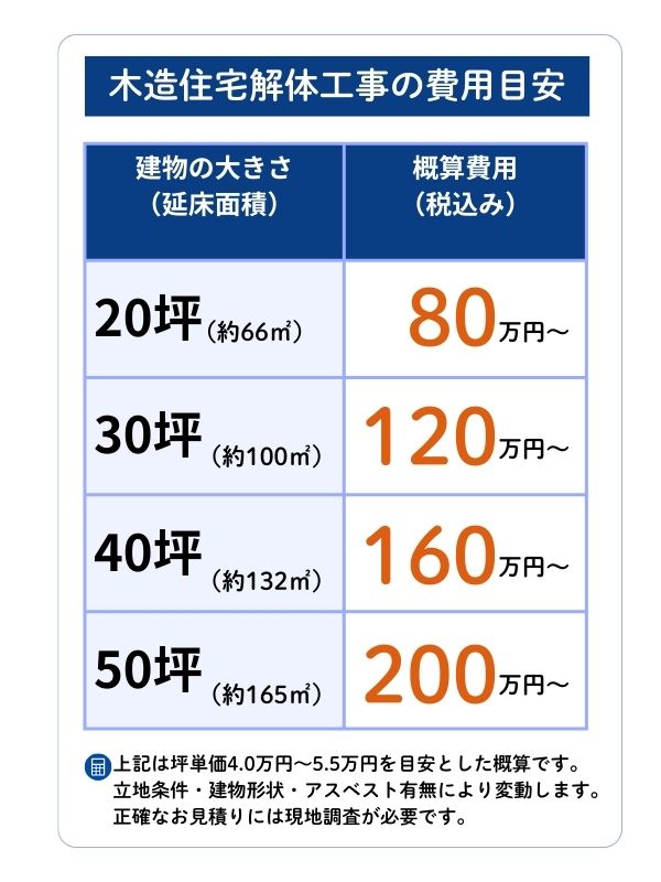 弊社の場合、木造2階建てで延べ床面積30坪(約100㎡)の場合、建物のみの解体で100万円~120万円前後です。同じ30坪でも平屋で駐車スペース等が十分あるなど、工事をしやすい環境が整っていれば80万円台からのご案内も可能です。
