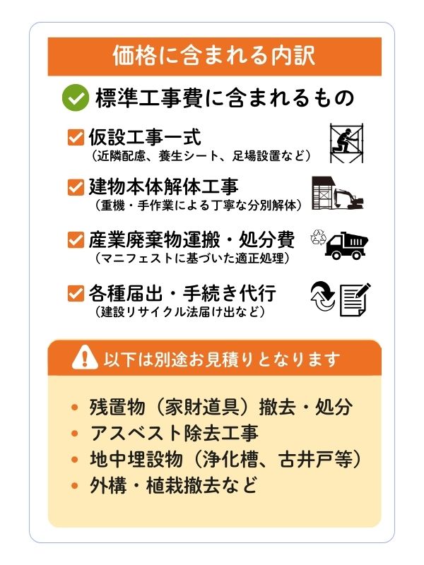 現地を確認したうえで発行するお見積りには建物以外の解体・撤去費用が含まれています。当サイトの「解体費用見積りシミュレーション」は建物のみの解体費用の概算価格を表示しています。