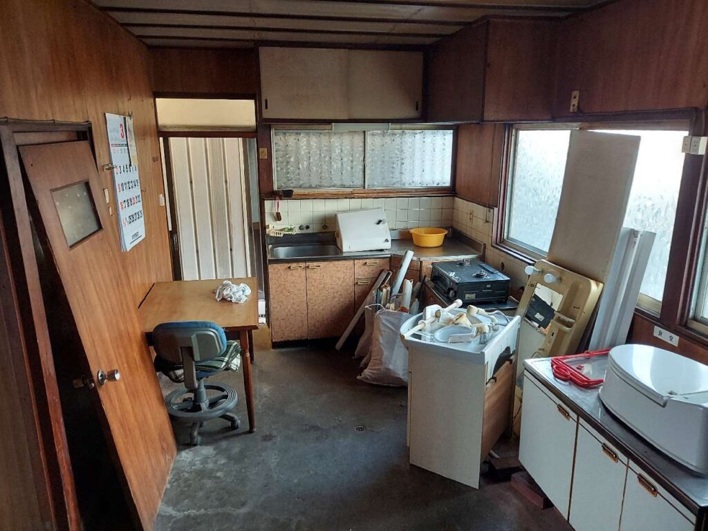 キッチンは昔ながらの造りで、流し台や収納棚がそのまま残っている状態でした。浴室もタイル張りの在来工法で、全体的に経年による傷みが見られました。
