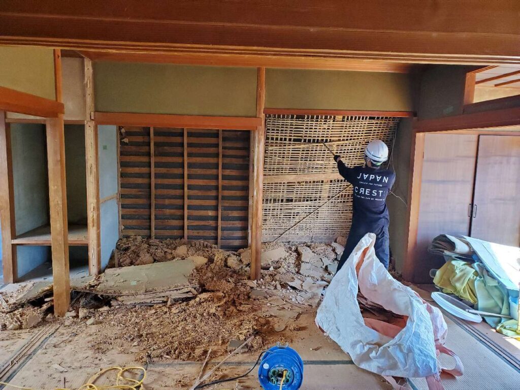 解体作業では、まず土壁の土を丁寧に落としていきます。写真では、土を落とした後の小舞が見えています。この竹の下地を見ると、昔の職人さんが一本一本手作業で編んでいったことがわかります。
