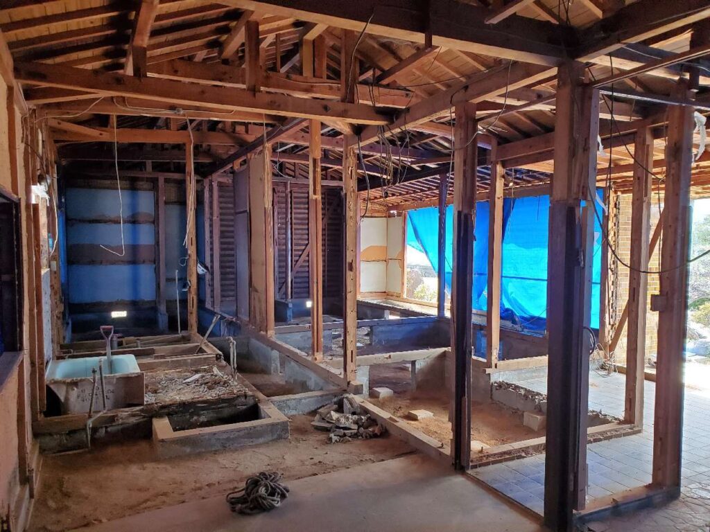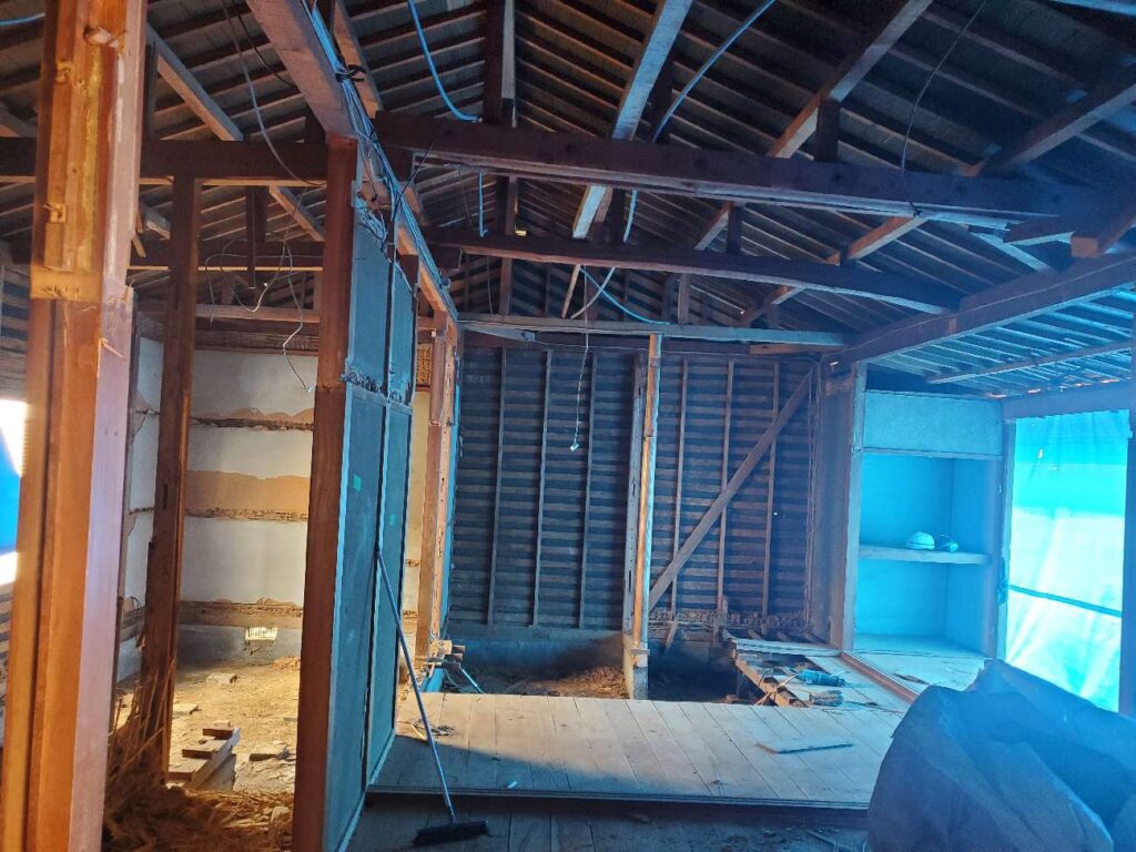 解体中盤の写真では、天井が撤去されて小屋組(屋根を支える木組み)が露出し、床も撤去されて基礎のコンクリートが見えています。建物の構造がはっきりとわかる状態です。