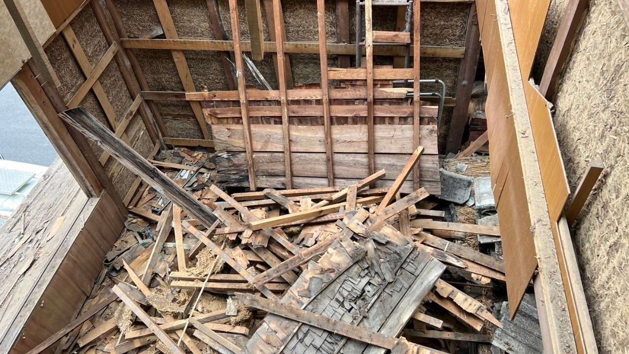 上の写真では、天井板が撤去され木組みの構造が露出した状態が確認できます。土壁は廃棄物処理において「混合廃棄物」とならないよう、木くず・土砂・金属をきちんと選別することが重要です。自社の産業廃棄物中間処理場で木くず・廃プラスチックなどを社内価格で受け入れできるため、適切な分別が最終的なコスト削減にもつながります。