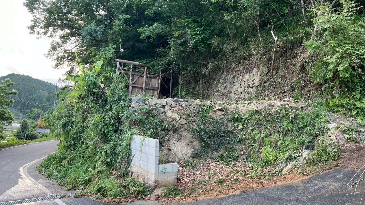 道路から物件を確認すると、建物全体が樹木・蔦・雑草に覆われており、建物の輪郭すら見えにくい状態でした。石積みの擁壁上に建てられた急傾斜地のため、重機のアプローチも容易ではありません。