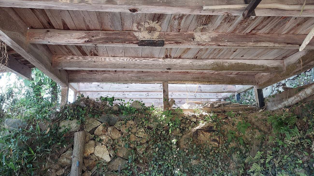 下の写真は家屋の下側の状況です。小屋組みの下に石積みが露出しており、長年の雨水浸入による腐朽も一部確認されました。昭和初期の古民家はこうした状況が多く、解体工事歴20年以上のノウハウが現場の判断に活きてきます。