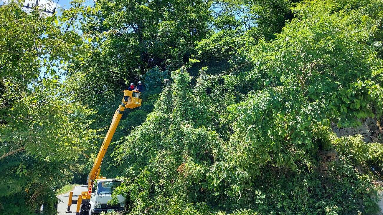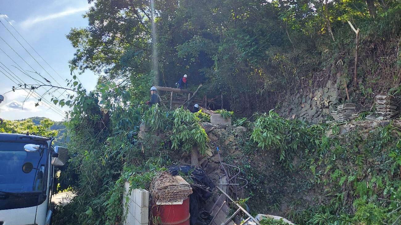 急傾斜地での高所作業は転落リスクを伴うため、安全帯・フルハーネスの装着を徹底し、作業範囲には立入禁止区域を設定して第三者の立入を防ぎました。安さを追求して安全対策を省くことは本末転倒です。作業員の命と近隣の安全を守ることが最優先事項です。