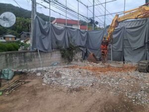 コンクリート基礎を重機で破砕・撤去しました。また、フェンス・カーポート・物置など外構部分も合わせて撤去しています。地中の排水桝・配管類も掘り起こして確認・処分しました。