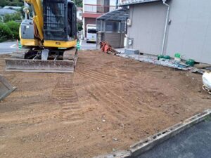 重機による粗整地を行い、敷地を更地の状態に仕上げました。足場・養生材を撤去し、周辺の清掃を行って工事完了です。